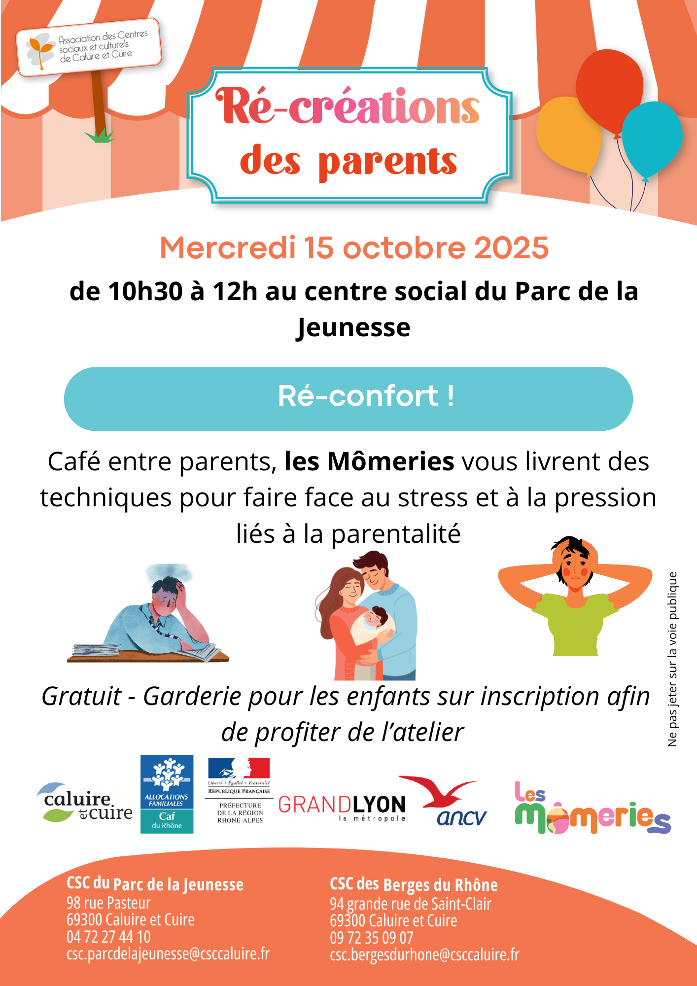 Gratuit sur inscription au 04 72 27 44 10 ou à csc.parcdelajeunesse@csccaluire.fr