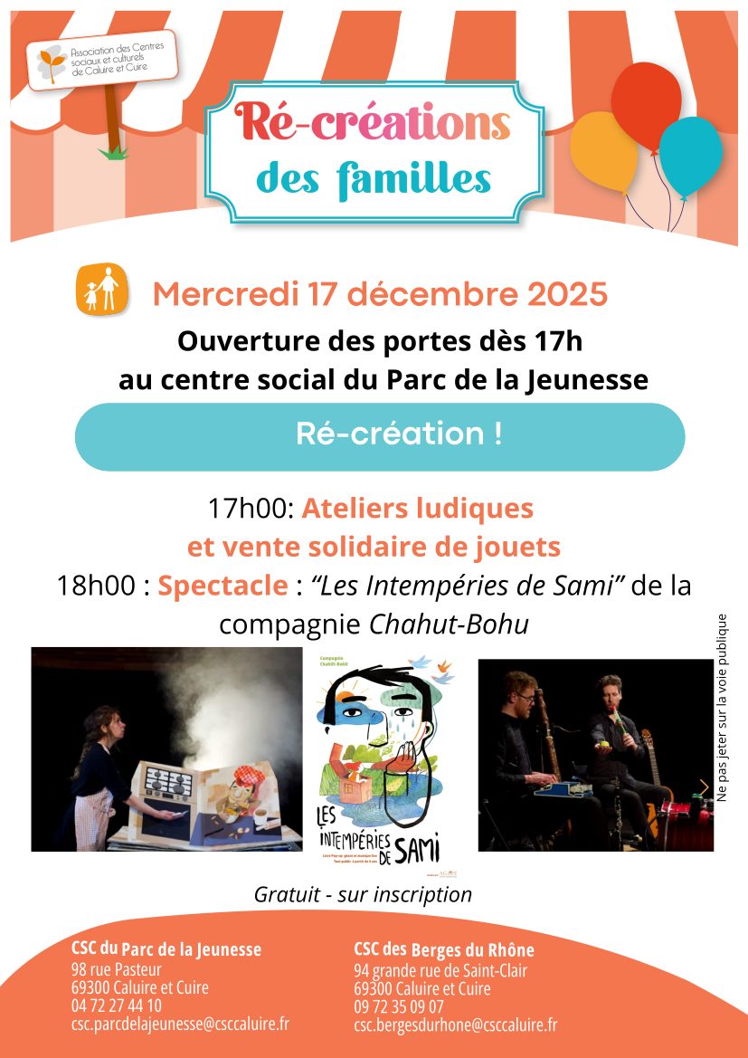 Gratuit sur inscription au 04 72 27 44 10 ou à csc.parcdelajeunesse@csccaluire.fr