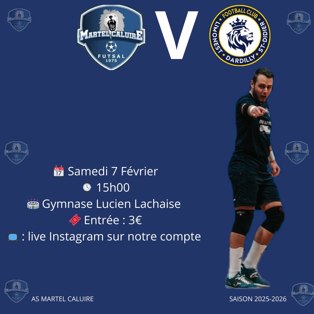 07/02/2026 - 15:00Ajouter au calendrieriCalendar Outlook Google Yahoo SPORT Gymnase Lachaise Caluire et Cuire VS Football Club Limonest Dardilly Saint-Didier A voir en direct sur la page Instagram de Martel Caluire
