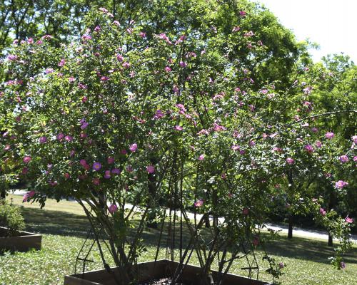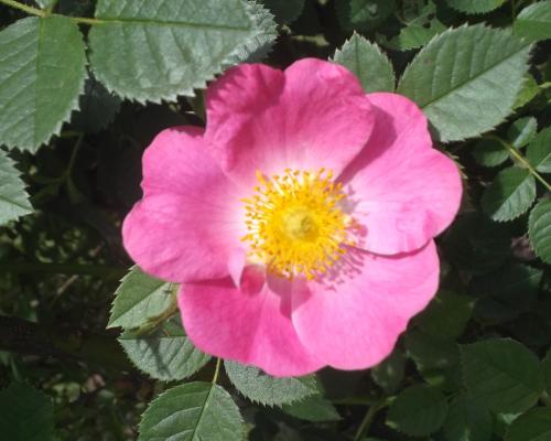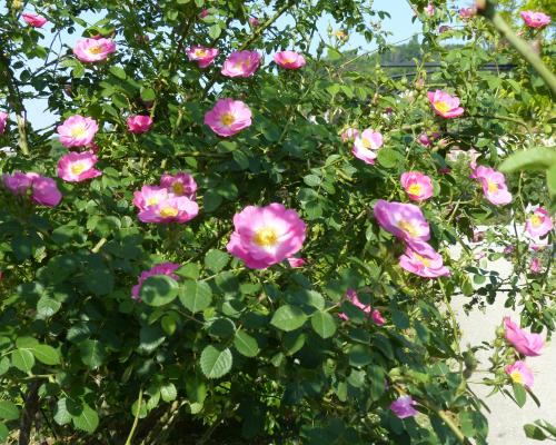 Rosier de grande dimension au port évasé : beau spécimen de fond de jardin. De nombreuses églantines d'un élégant rose vif, semi-doubles, habillent ce rosier dont le feuillage sent la pomme verte.