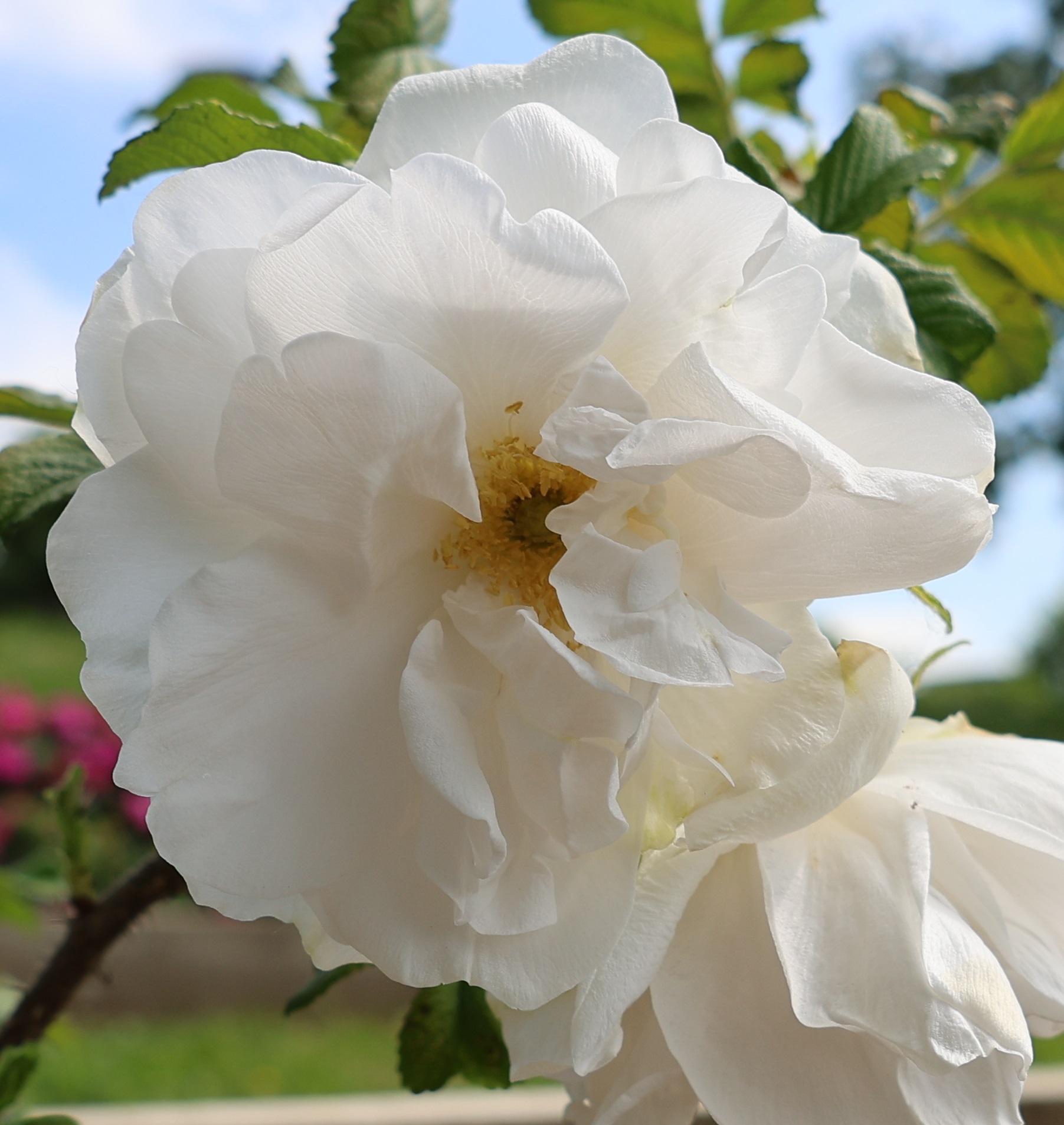Bel arbuste touffu vigoureux au très beau feuillage gaufré toujours sain, fleurs blanc pur, semi-doubles, très parfumées, remontant; il peut devenir un petit arbre en forme libre