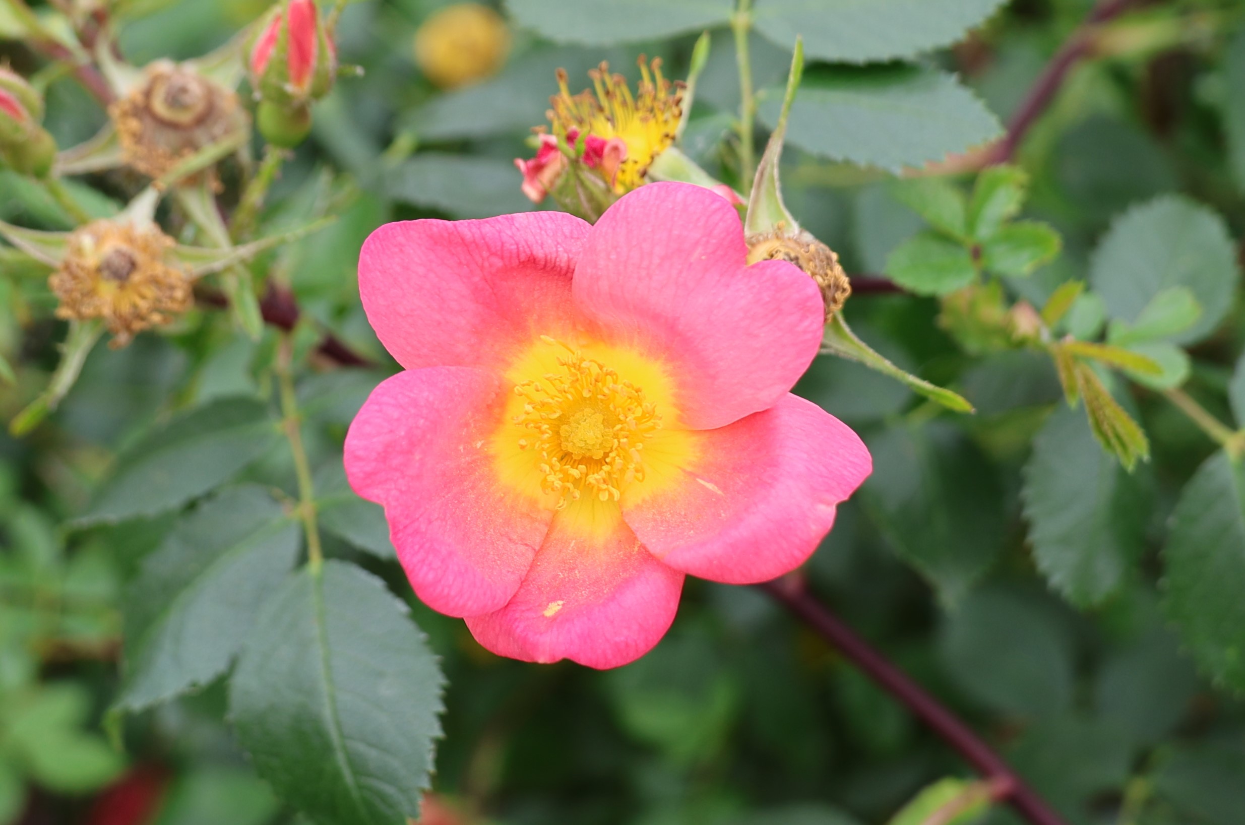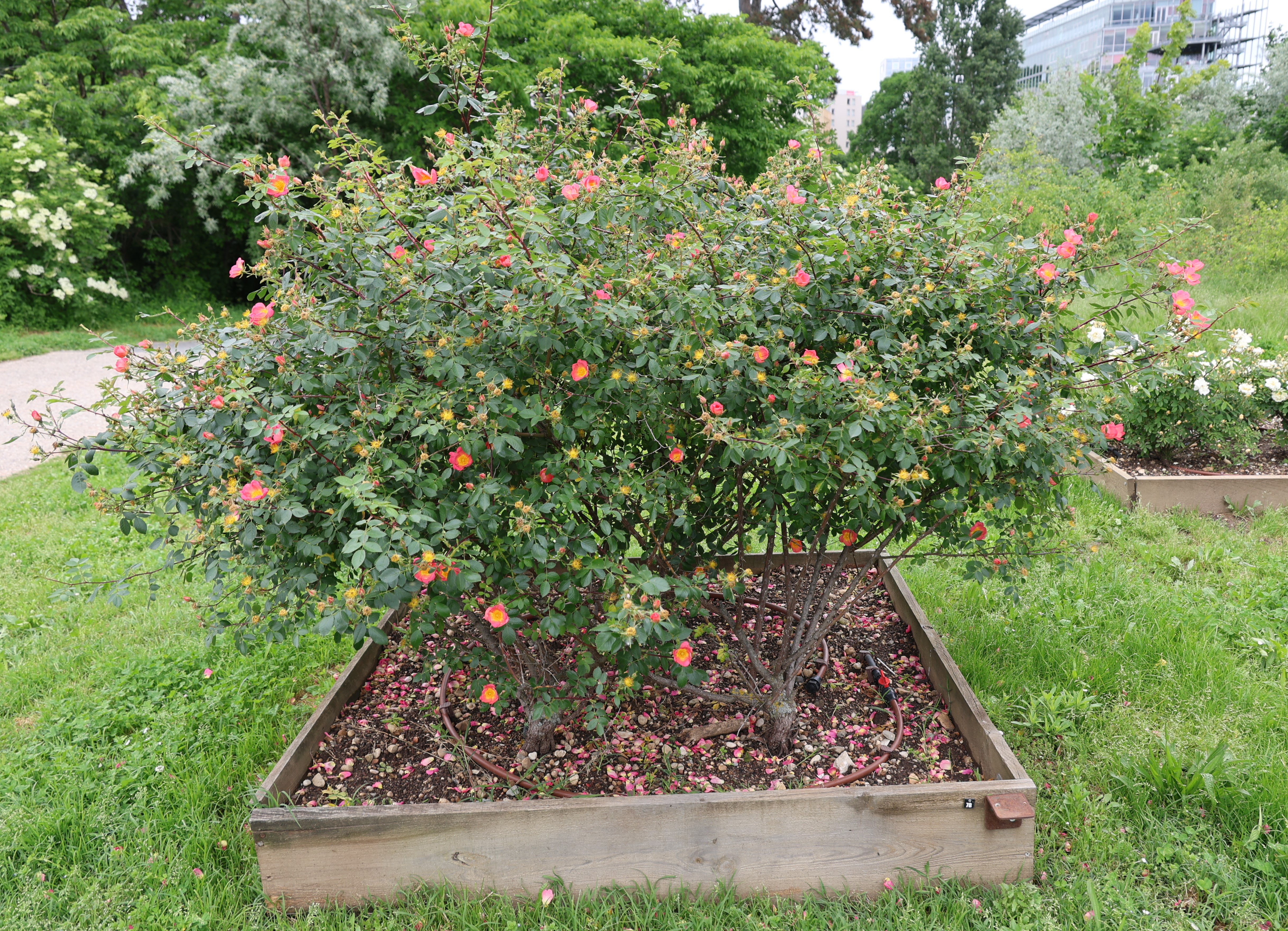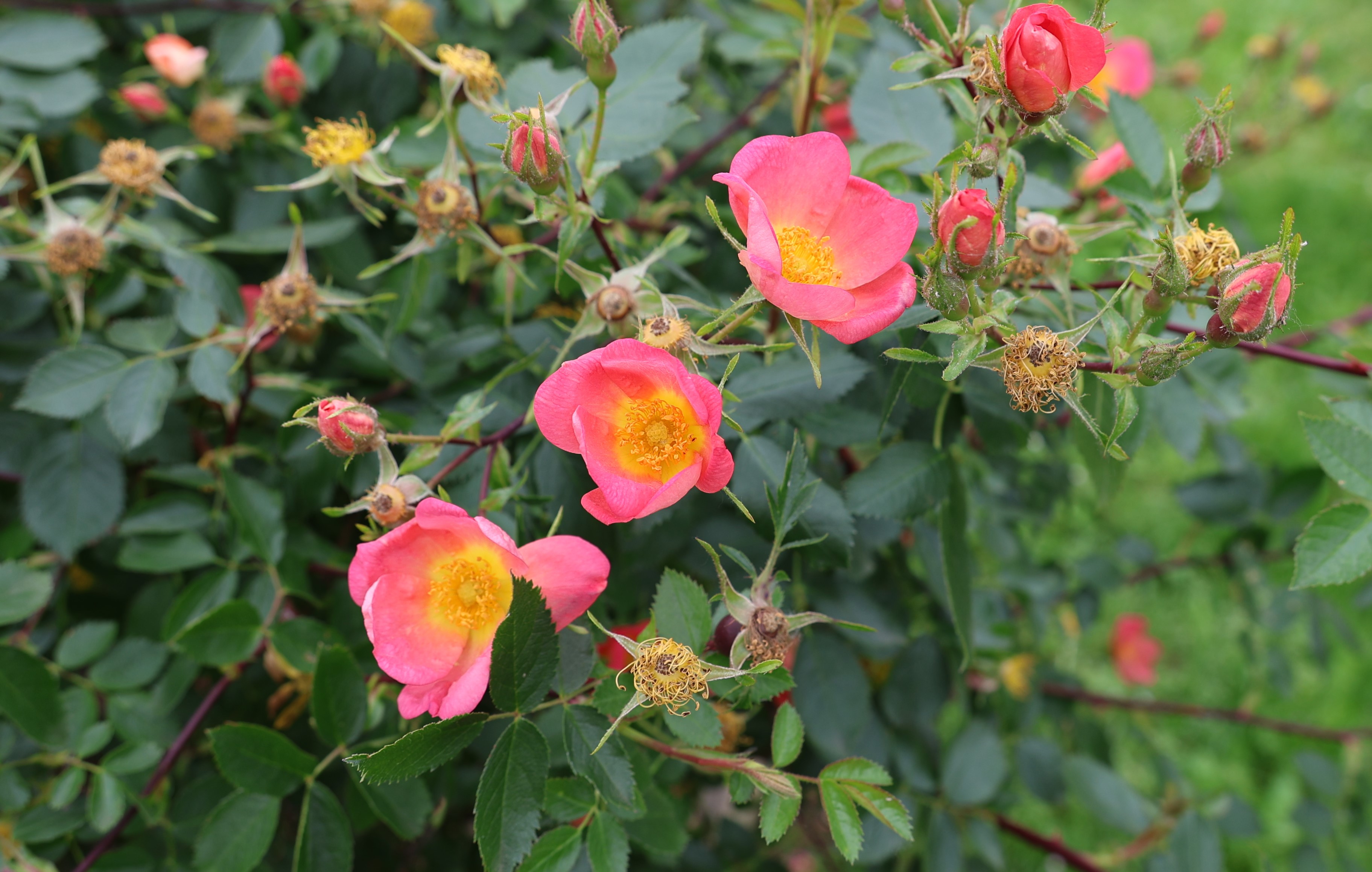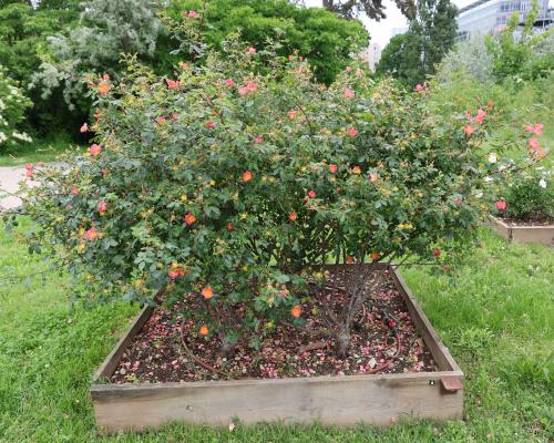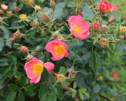 De petites fleurs simples de couleur très originale, corail, apparaissent relativement tôt. Un arbuste souple portant un petit feuillage vert mat au parfum de pommes vertes. ‘Lady Penzance’ est avant tout une plante à conserver pour ses origines : descendant d’un croisement entre R. rubiginosa et R. foetida ‘Bicolor’.