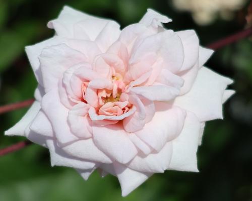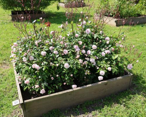 Magnifique petit rosier buisson presque inerme, feuillage vert tendre Il se couvre de petites fleurs pleines d'un rose carné ; il ne cesse de fleurir jusqu'aux gelées.