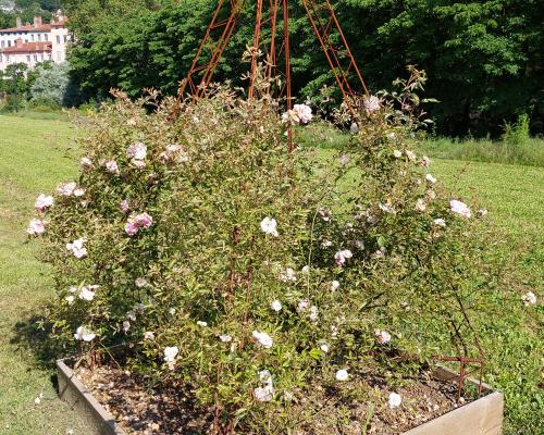 Mme. Sancy de Parabère' est un rosier Boursault qui fleurit tôt avec de grandes fleurs en coupe, elles exhalent un agréable parfum, fleurs très gracieuses. Une variété robuste