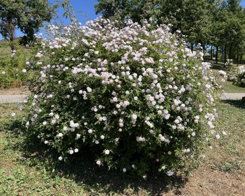 Paul's Himalayan Musk est l'un des meilleurs et des plus beaux rosiers lianes, avec ses longues branches souples et pendantes pouvant atteindre 10 m. Elles portent de délicats bouquets peu serrés et retombants, de petites fleurs en rosette.