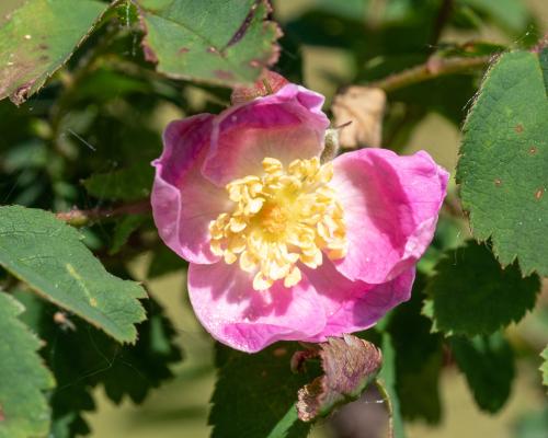 C'est l'un des rosiers qui tolèrent l'ombre. Il a de petites folioles ovales , de petites fleurs rose qui sont suivies de petits fruits ronds.
