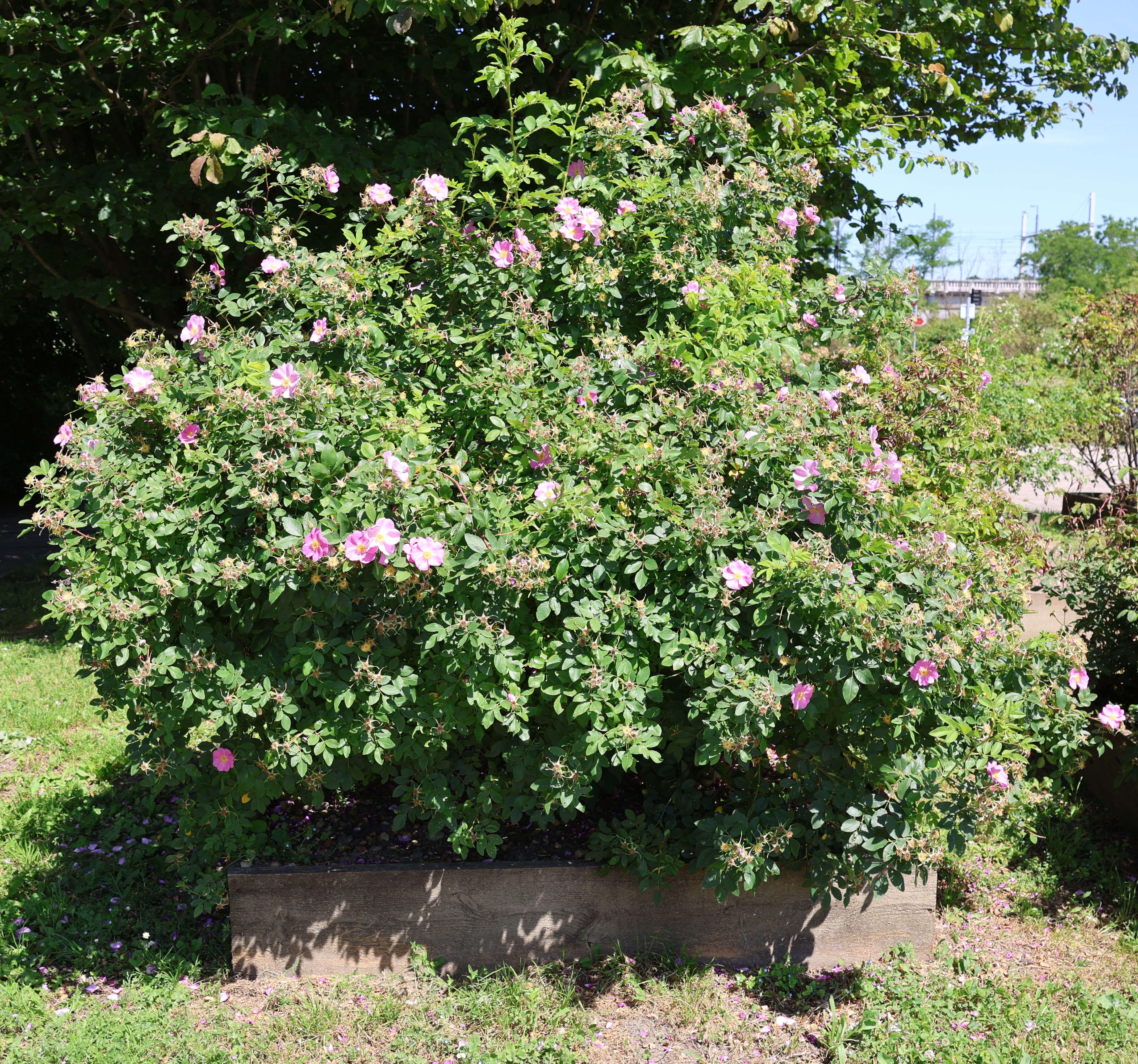 Très vigoureux, peu exigeant et résistant bien aux insectes et maladies, il s'installe en massifs ou en haie libre. Ce rosier sera apprécié pour ses très belles couleurs d'automne (Son feuillage nait pourpre au printemps, devient vert en été puis rouge sombre en automne, pour sa floraison, estivale pleine de charme avec églantines parfumées d'un rose clair. Elles sont suivies de petits fruits rouges qui persistent longtemps sur les rameaux nus,