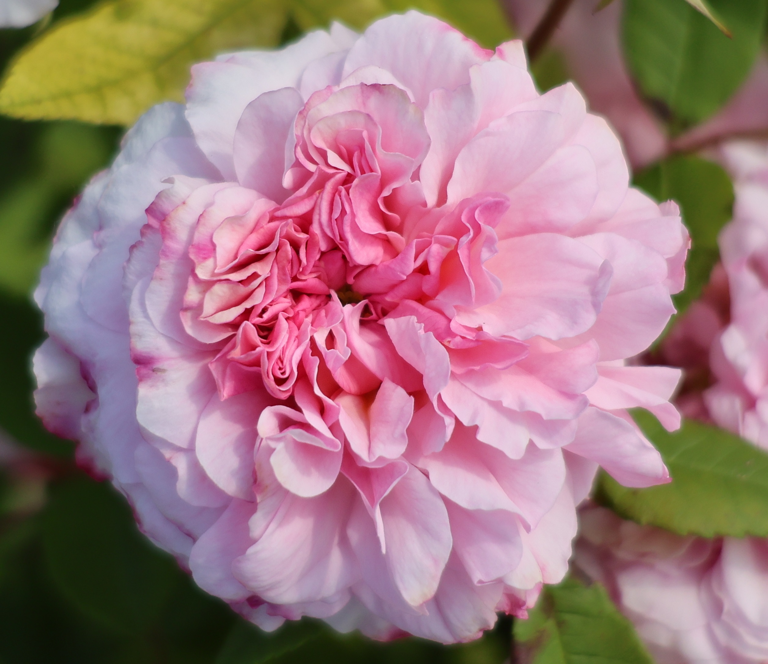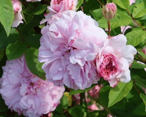 Grimpant à fleurs moyennes et parfumées; Fleur très double rose clair, boutons ronds, grands et veloutés,